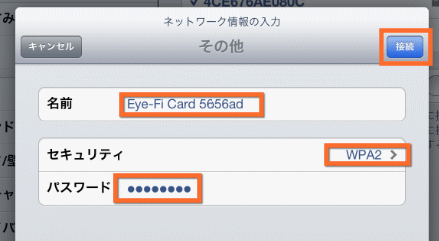 その下のパスワードは、「WPA2 パスワード」を入力して、右上の「接続」をタップしてみてください。