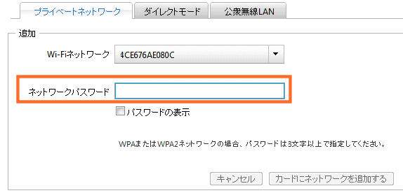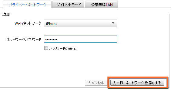 パスワードを入力したら、「カードにネットワークを追加する」をクリックします。