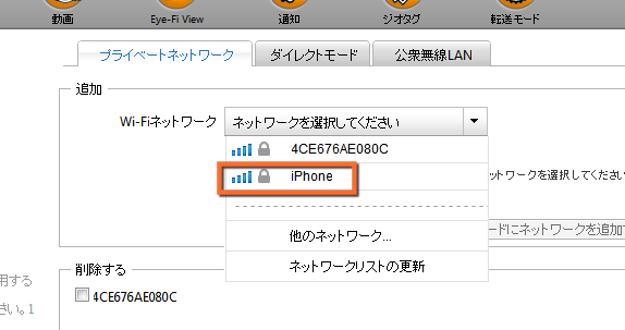 これで、Eye-FiのSDカードに内蔵されている小さなWi-Fi受信機にWi-Fi接続用の設定を記憶させることが出来ました。