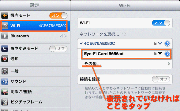 もし、どうしてもこの「Eye-Fi Card XXXX」という名前がネットワークの一覧に表示されない場合は、その下の「その他」をタップします。