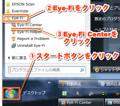 スタートボタンをクリックし、「すべてのプログラム」の中の「Eye-Fi」にある「Eye-Fi Center」をクリックします。