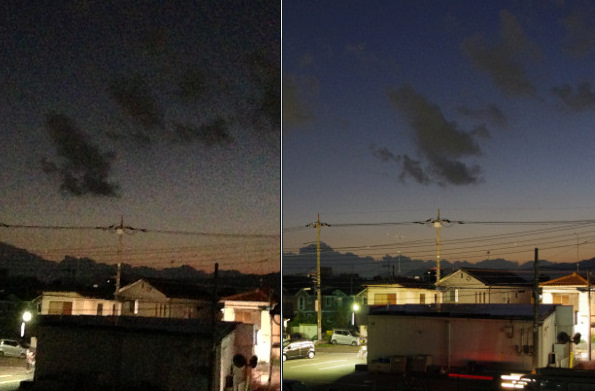 写真は、左がiPhone5で撮影。右はデジタル一眼レフカメラで撮影した夕焼けです。