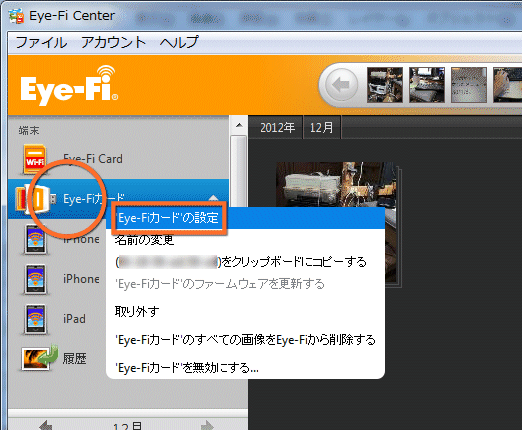 左側に「Eye-Fiカード」という表示があるので、ここを右クリックし、表示されたメニューの中から「Eye-Fiカードの設定」をクリックします。