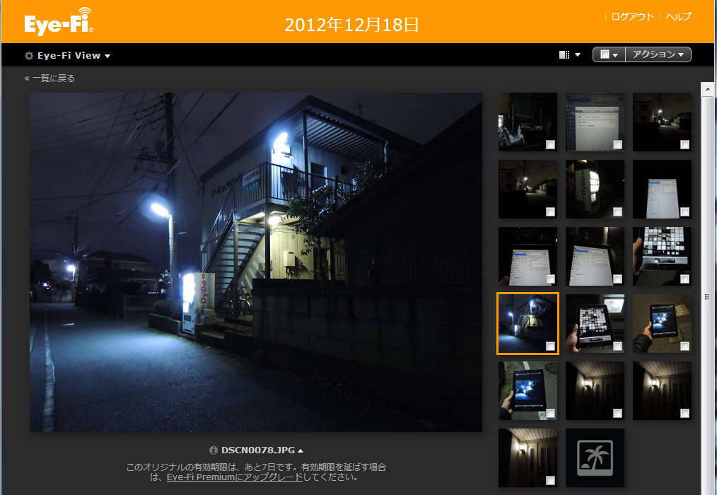 Eye-Fiを使えば、Eye-Fi Centerをインストールしたパソコンや、アプリをインストールしたiPhoneやiPadに自動で転送されるんですけれど、会社や友だちのパソコンのようなEye-Fi Centerをインストールしていないパソコンにもブラウザ上からダウンロードしたり、見たりすることができます。