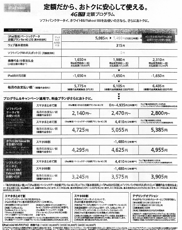 iPad miniしか契約していない場合、月々の支払料金は16GB版で機種代込で5,775円だったので、すでにiPhoneなどSoftBankの携帯電話を契約していれば、月々1,000円ほど安くなることになります。