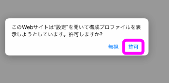 「このWebサイトは"設定"を開いて構成プロファイルを表示しようとしています。許可しますか?」と表示されるので、「許可」をタップします。