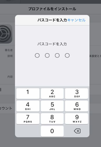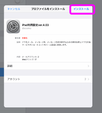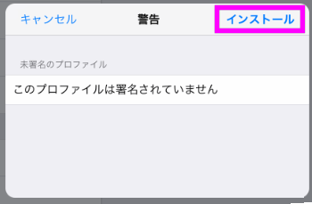 「プロファイルをインストール」という画面が表示されるので、右上の「インストール」をタップします。