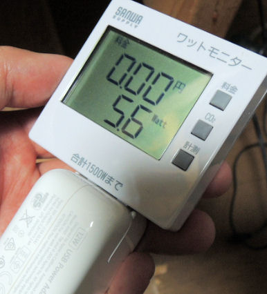 これでiPhone5を充電したらもっとはやく充電できるんじゃないか、と思ってiPhone5を繋いで計測してみると・・・。5.6Wにセーブされて充電しているようです。