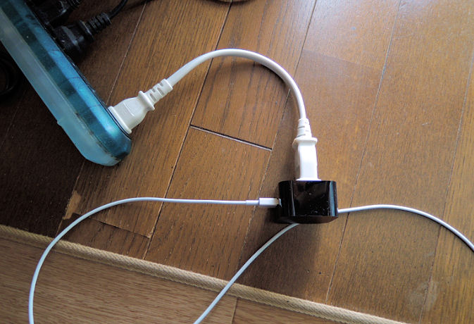 すごくおしゃれな充電器だったんですけれど、ちょっと横幅が広くてこのように延長コードに刺して使わないと、2つ分のコンセントを占領してしまいます。