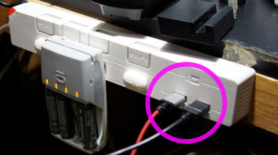 スイッチ付きなので写真のようにニッケル水素電池の充電器を刺したままでも使わない時は、オフにしておけば通電しないので便利。