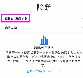 なにか不具合があった時に、解決策が送られてくるように「診断」の「自動的に送信する」をタップしてください。