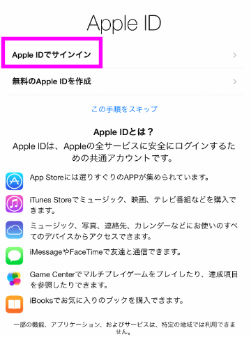 すでにiPhoneを持っている場合は、iPhoneで使用しているApple IDを使用することで有料アプリや購入した音楽をiPadでも使用できます。