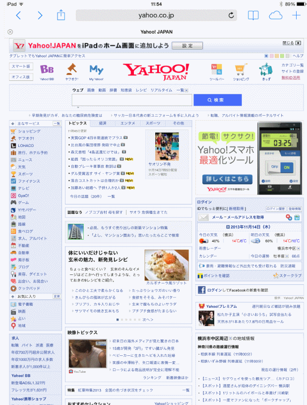 旧iPad miniでは文字が潰れてしまっていたYahoo!JAPANのトップページでしたが、Retinaではくっきり読むことが出来ます。