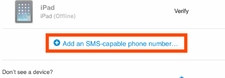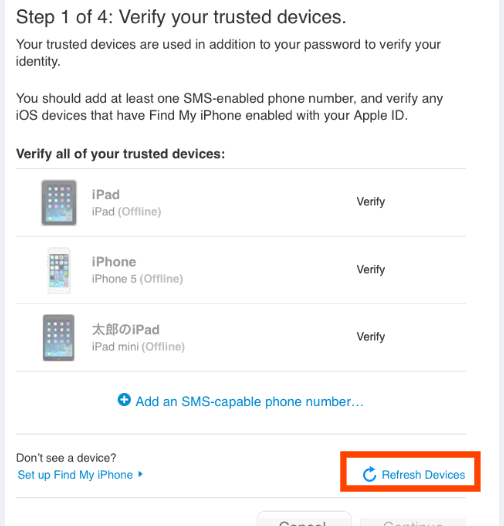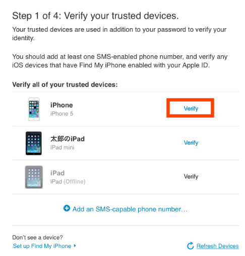 信頼できるデバイス(登録してあるiPhoneなど)か、登録した電話番号にSMSを送るか選択します。
