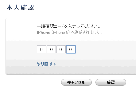 パソコンのiTunesの画面にも、本人確認用の4桁の入力欄が表示されるので、届いた4桁の一時確認コードを入力します。