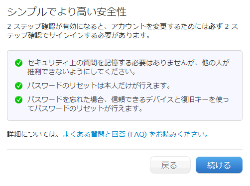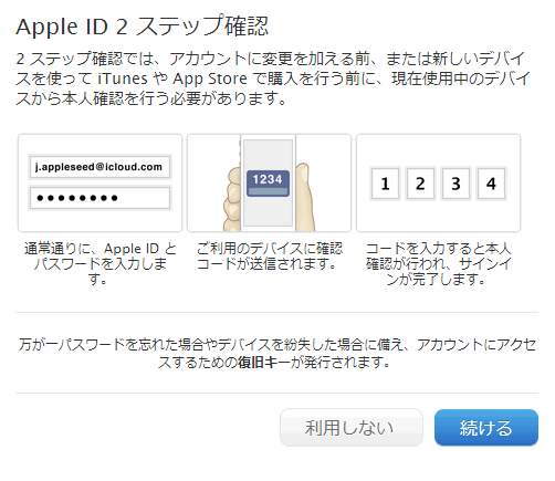 Apple ID 2ステップ確認の使い方が表示されるので、「続ける」をタップします。