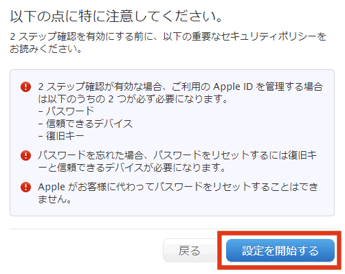 2ステップ確認の注意点が表示されるので「設定を開始する」をタップします。