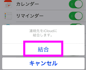 これは現在iPhoneのみに保存されている連絡先と、iCloud上に保存している連絡先の両方を加えていいか、ということなので「結合」をタップしてください。
