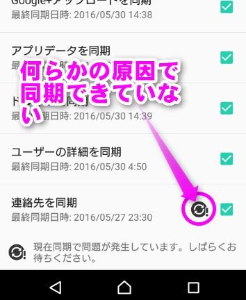 電波の状態が悪かったり、一度に大量の連絡先を削除すると、このように同期できない場合があります。