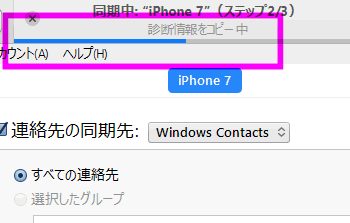 ここが、「iCloudの連絡先はOTA(Over The Air)でiPhoneと同期中です」と表示されている場合は、iCloud経由で同期されているので、Windowsとは同期できません。
