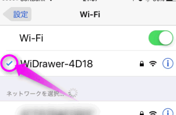 一覧の中に「WiDrawer-XXXX」というようなネットワークがあるので、ここをタップします。
