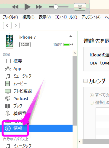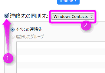 iTunesの中央部に「連絡先を同期」という項目があります。