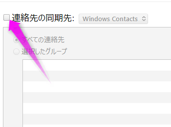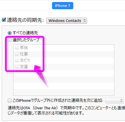 同期が完成すると、iTunesの「連絡先の同期先」が少し変化していました。