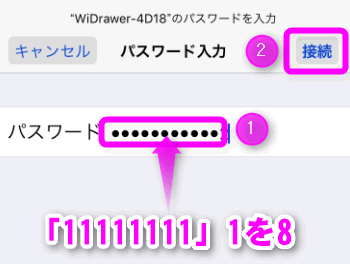 パスワード入力が表示されるので、「11111111」(1を8つ)入力し、右上の「接続」をタップします。