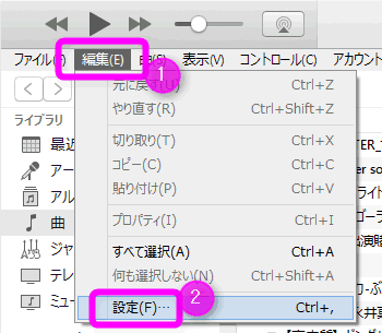 パソコンとiPhoneを繋げたときに勝手に同期しないようにするには、iPhoneとパソコンを繋ぐ前に、iTunesを立ち上げ、①「編集」をクリックし、②「設定」を開きます。