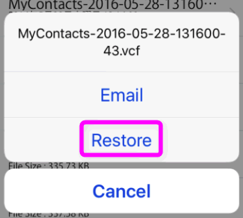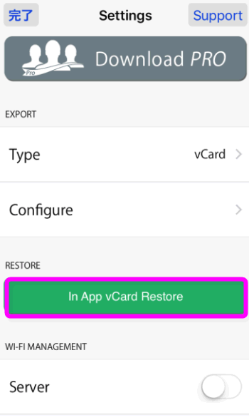 「RESTORE」の部分にある「In App vCard Restore」をタップします。