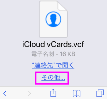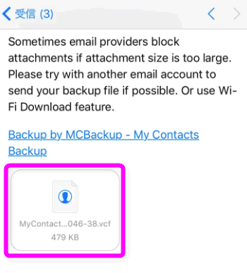 復元したいiPhoneで、送信したメールを開くと「MyContect...vcf」というようなファイルが添付されています。