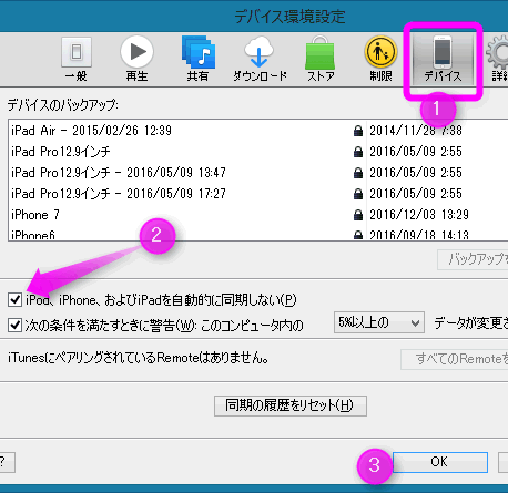 ①「デバイス」をクリックし、②の「iPod、iPhone、及びiPadを自動的に同期しない」のチェックを外します。