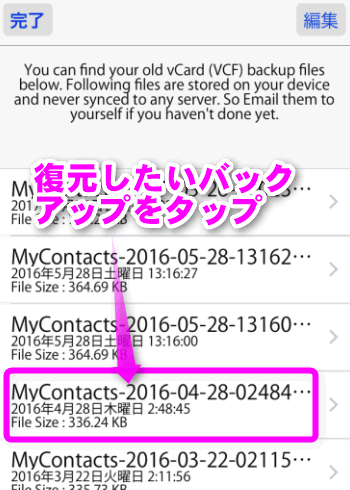 *注意 連絡先に残っているアドレスに追加されてしまうので、重複する可能性がある場合はいったんすべての連絡先を削除してから復元することをおすすめします