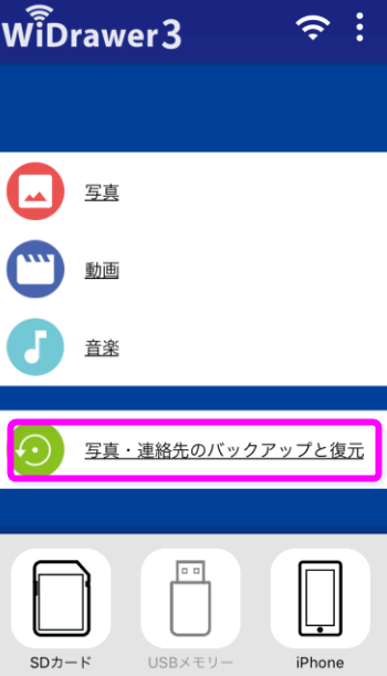 復元はかんたん。このカードリーダー(REX-WIFISD1 )に接続した状態で、「写真・連絡先のバックアップと復元」をタップ。