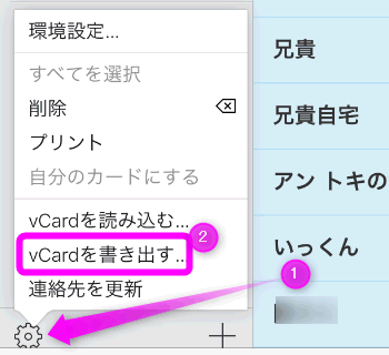 この状態でもう一度先程のダイヤルをタップし、今度は②「vCardを書き出す」をタップしてください。