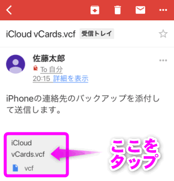 何らかの原因で連絡先が消えてしまった場合は、バックアップファイルを添付したメールを開き、添付してある「iCloud vCards.vcf」をタップします。