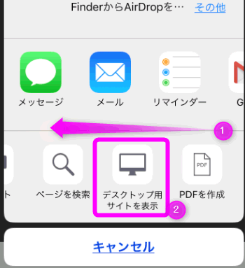 下段にある「デスクトップ用サイトを表示」(右から左へスワイプさせると見つかります)をタップします。
