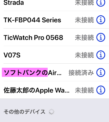 もし「AirPods」が見つからない場合、「所有者の名前のAirPods」という名前になっているかもしれません。その場合、一番下あたりにあるはずです。