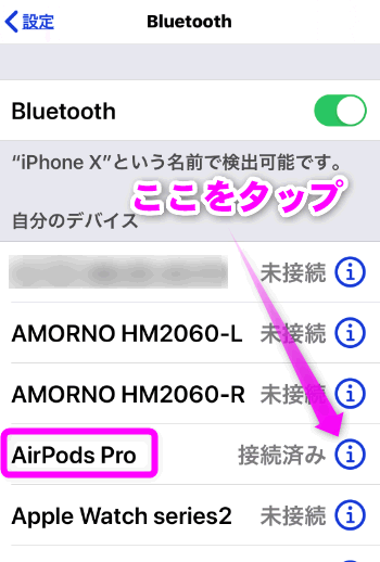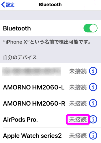 AirPodsの電源が入っていないか手元にない場合は、このように「未接続」となっているはずです。この場合も(i)の部分をタップします。