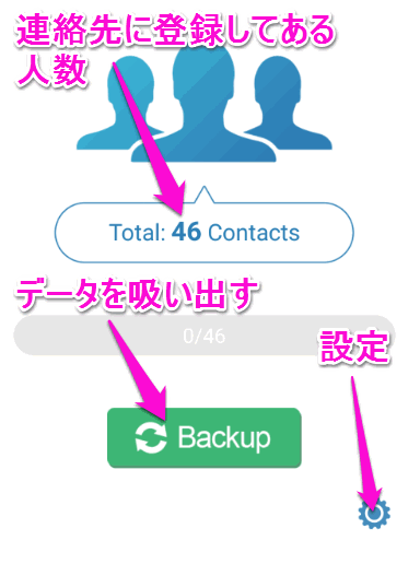 連絡先に登録してあるデータを読み込むので、「Backup」をタップします。