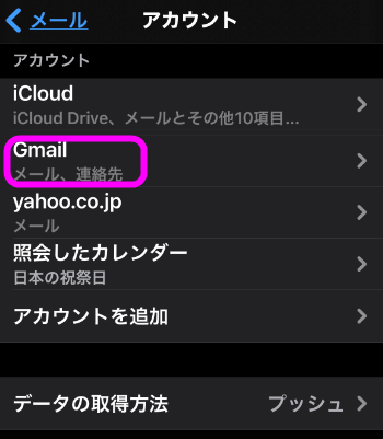 登録してあるアカウントが表示されます。ここで「iCloud」はAppleアカウントの連絡先(最初からあるアカウント)になります。