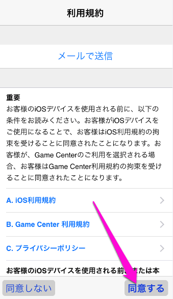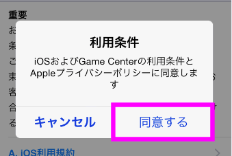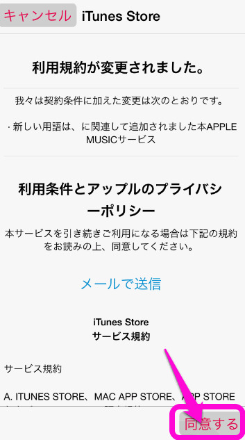 iTunes Storeの利用条件とアップルのプライバシーポリシーが表示されるので、目を通したら右下の「同意する」をタップします。