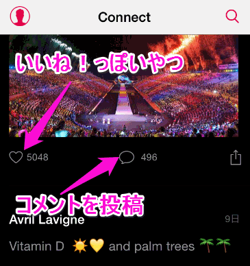 この「Connect」とは、Apple版のツイッターのようなもので、アーティストのつぶやきや更新データをチェックしたり、つぶやきを投稿したりすることが出来る機能っぽい。