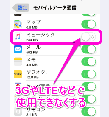 にある「モバイルデータ通信」を開き、下の方にある「ミュージック」をオフにしておくと、Wi-Fiに接続している時でないと、再生できないように出来ます。