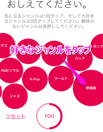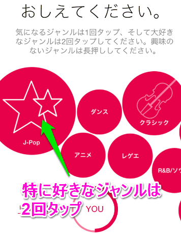 初めて使う場合は、丸の中にジャンルが記述されているので、好きなジャンルをタップします。すると、タップした丸が他のジャンルより一回り大きくなります。