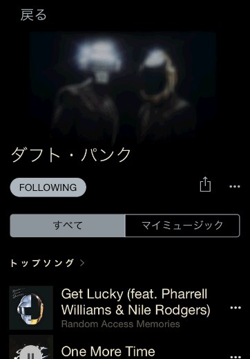アーチストで見つかったダフト・パンクをタプすると、人気曲やアルバム一覧が表示されました。