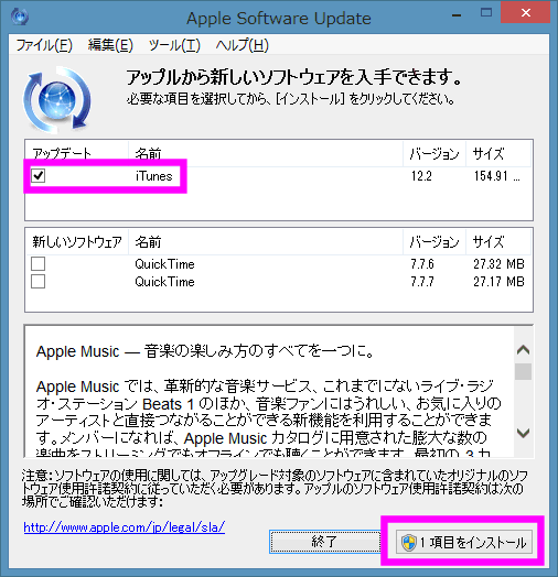 iTunesにチェックが入っていることを確認して、「1項目をインストール」をクリックします。