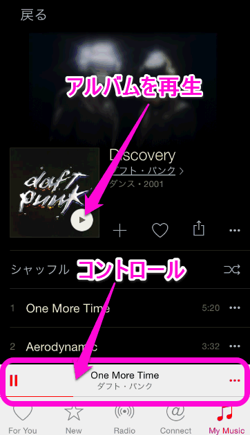 アルバムのDiscovery - ダフト・パンクを開くと再生ボタンがあるので、タップすると再生が始まります。