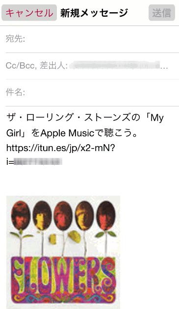 左下の「共有」ボタンをタップすると、友達に曲やアーティスト、アルバムを紹介することも出来ます。