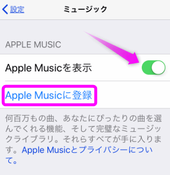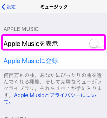 もし、Apple Musicが必要ない場合は、以下のようにして表示させないようにすることも出来ます。